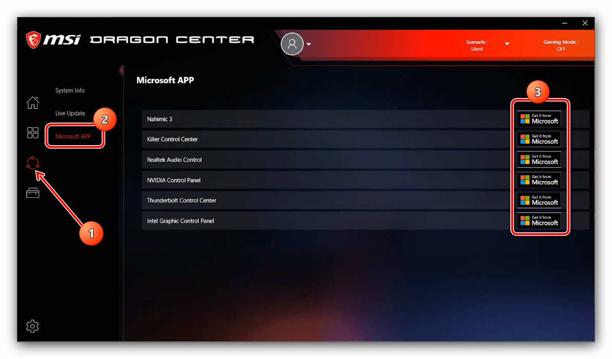 - Для установки дополнительного софта откройте вкладку «Microsoft APP». Здесь находится перечень программ, которые можно инсталлировать для увеличения функциональности MSI Dragon Center. Для начала загрузки воспользуйтесь кнопкой «Get it from Microsoft» – после её нажатия откроется Microsoft Store, откуда и происходит загрузка.