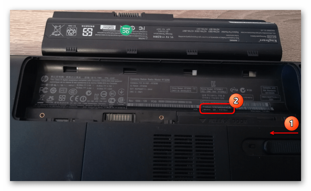 У старых устройств, оставшихся без наклейки по тем или иным причинам, понадобится снять батарею. Для этого сдвиньте защелку, удерживающую аккумулятор, в сторону, извлеките его и найдите в углублении текст. Как и в двух предыдущих случаях, вам следует найти строки «Model» и «Product». Если лэптоп неразборный, переходите к следующим методам статьи.