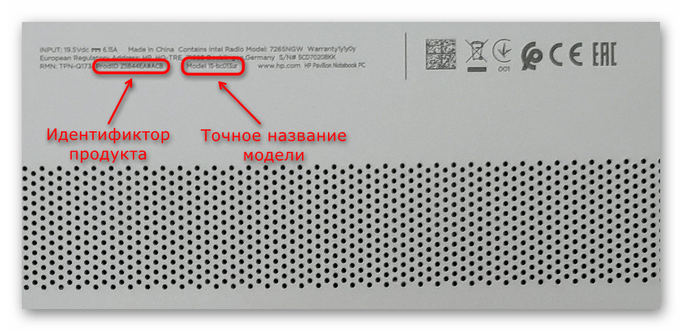 Если наклейки нет, вместо этого ищите искомые данные, нанесенные прямо на корпус. Текст и информация в зависимости от модели HP отличаются, но практически всегда не составляет труда найти параметры «Model» и «Product»/«ProdID».