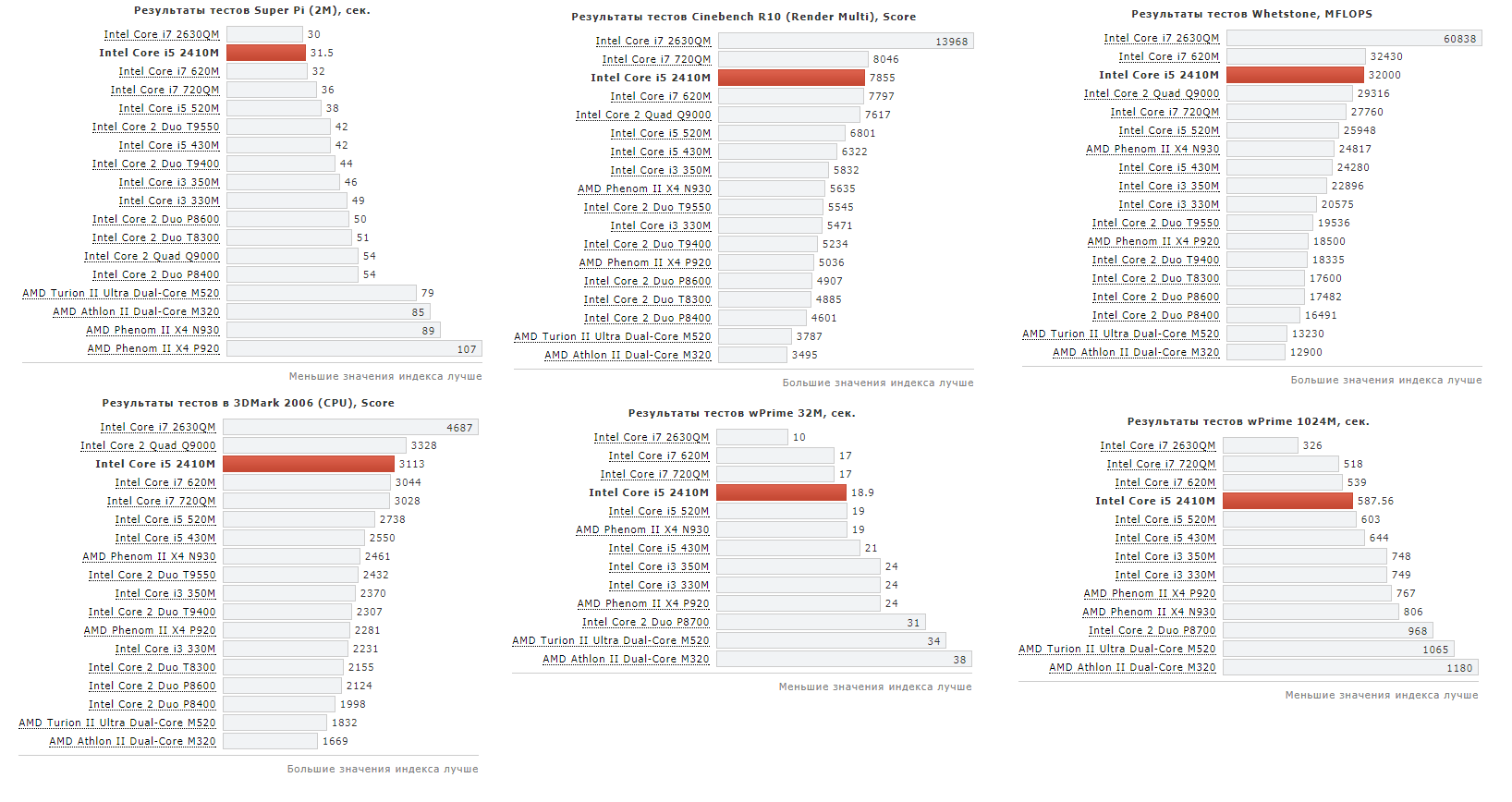 Как видите, Core i5-2410M практически везде был на втором-третьем месте. Более новые процессоры, конечно, вырывались вперед. В любом случае, процессор, который используется в рассматриваемом ноутбуке, очень даже неплох.