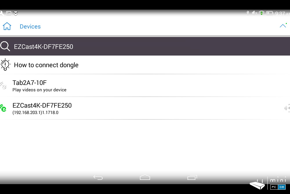 - — in the EZCast app, use the first icon on the top-right, the blue «V» to select the device to connect to