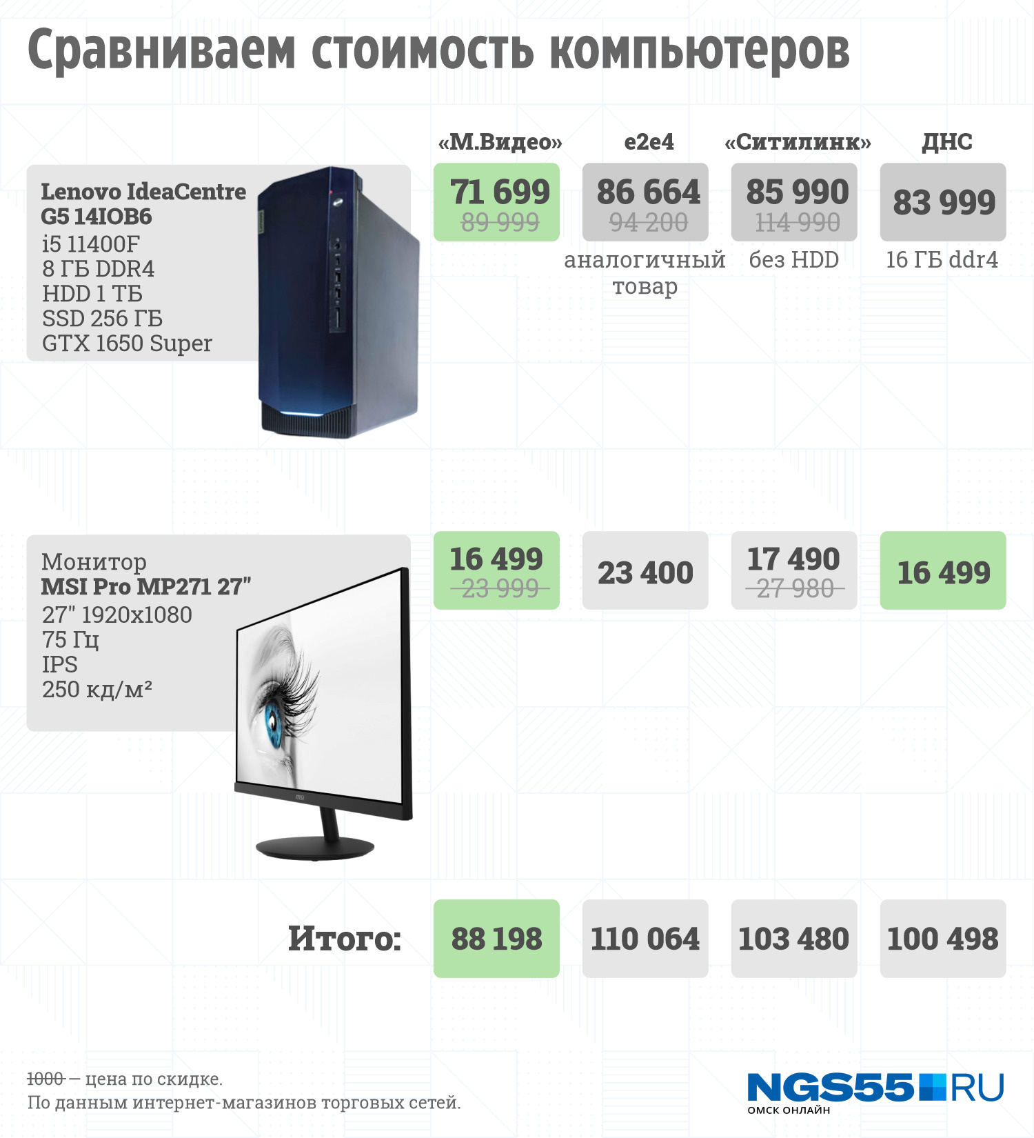 Найти системные блоки одинаковой сборки, еще и за разумные по нынешним меркам деньги, оказалось не так просто. И всё же мы постарались подобрать характеристики, которые справятся со всеми задачами — от офисных программ и видеоредакторов до современных игр. Нам подошел Lenovo IdeaCentre G5 14IOB6 (Intel Core i5 11400F, 8 ГБ ОП, 1000 ГБ (HDD), 256 ГБ (SSD), NVIDIA GeForce GTX 1650 Super, Windows 10/11). В «Ситилинк» была только версия без HDD, а в ДНС — с увеличенной вдвое оперативкой. Для полноты картины мы также на свое усмотрение добавили к сравнению 27-дюймовый монитор MSI Pro MP271 с IPS матрицей.