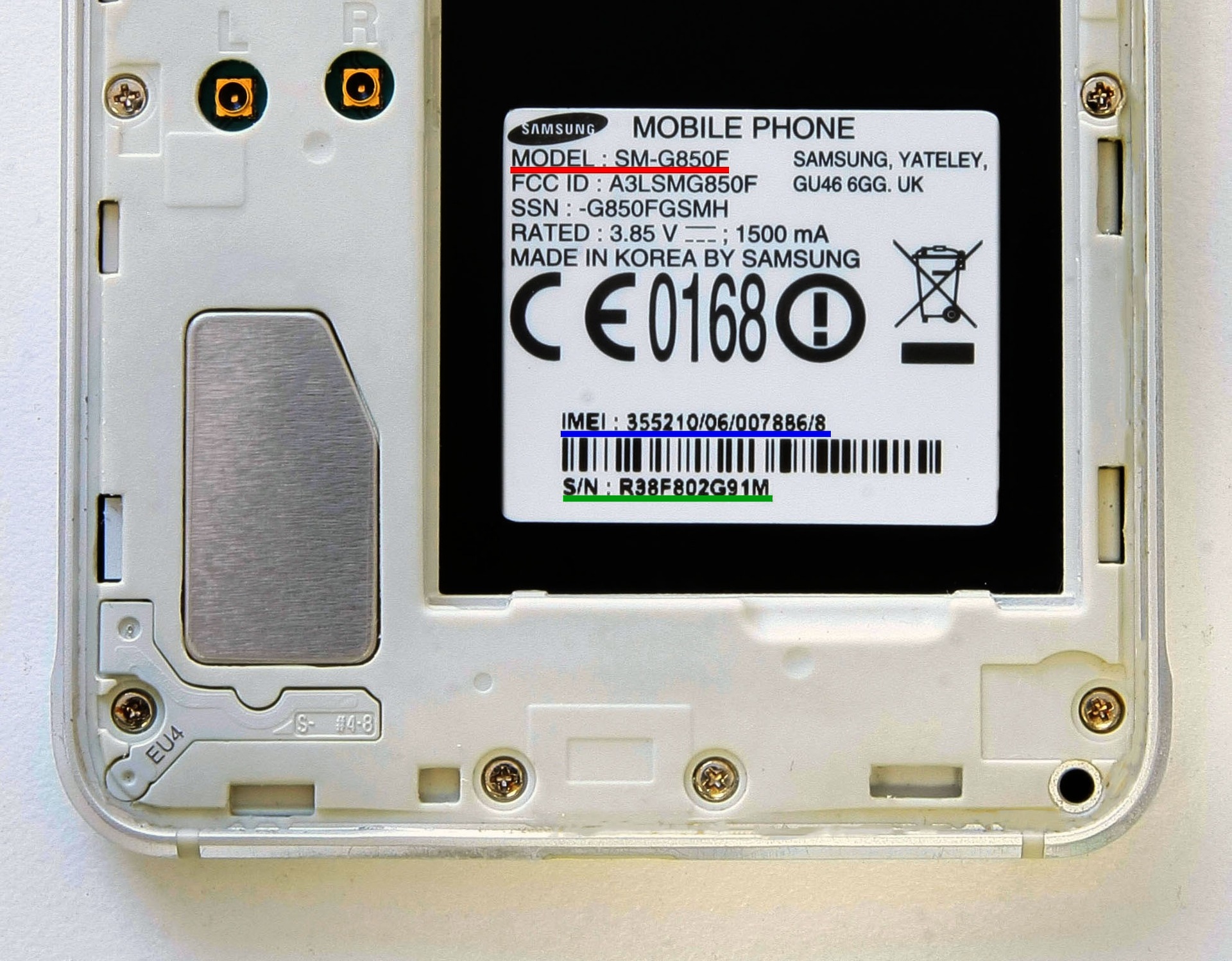 Если батарея и задняя панель снимаются, под ними находится заводская табличка. На заводской табличке указаны модель , IMEI и серийный номер .