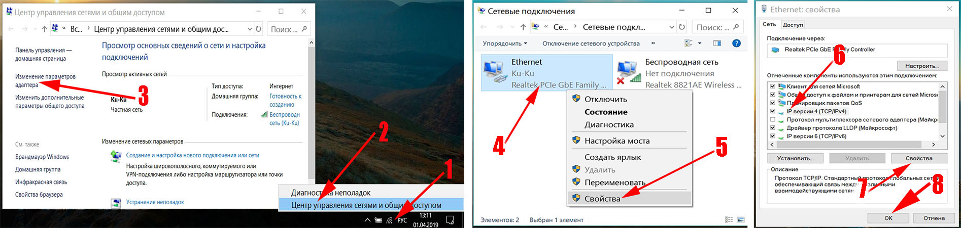 Клацаем на иконке «Сеть» ПКМ и выбираем «Центр управления…». Дальше в появившемся окне с левой стороны нажмите на строке «Изменить параметры адаптера».