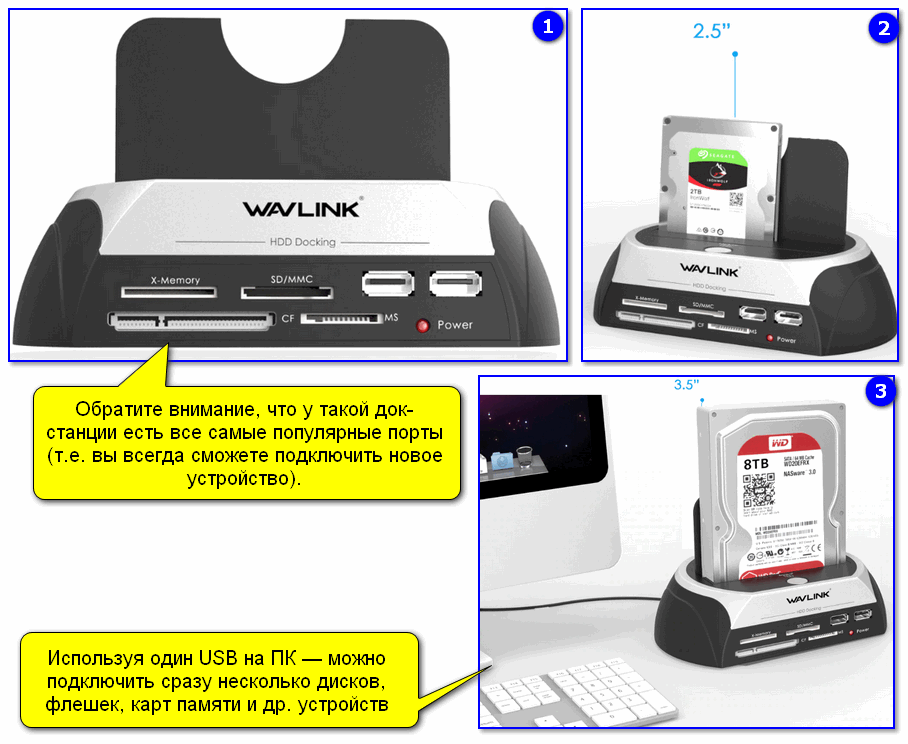 Этот вариант подойдет в том случае, когда вы хотите быстро и легко подключать сразу несколько жестких дисков к USB-порту (разумеется, это не переносной вариант). Как правило, многие док-станции оснащены доп. портами: USB, SD/MMC, X-Memory, MS и пр. (см. фото ниже).