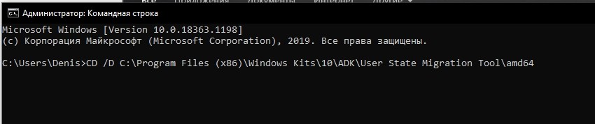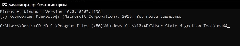 введите команду CD / DC: Program Files (x86) Windows Kits 10 ADK User State Migration Tool amd64;