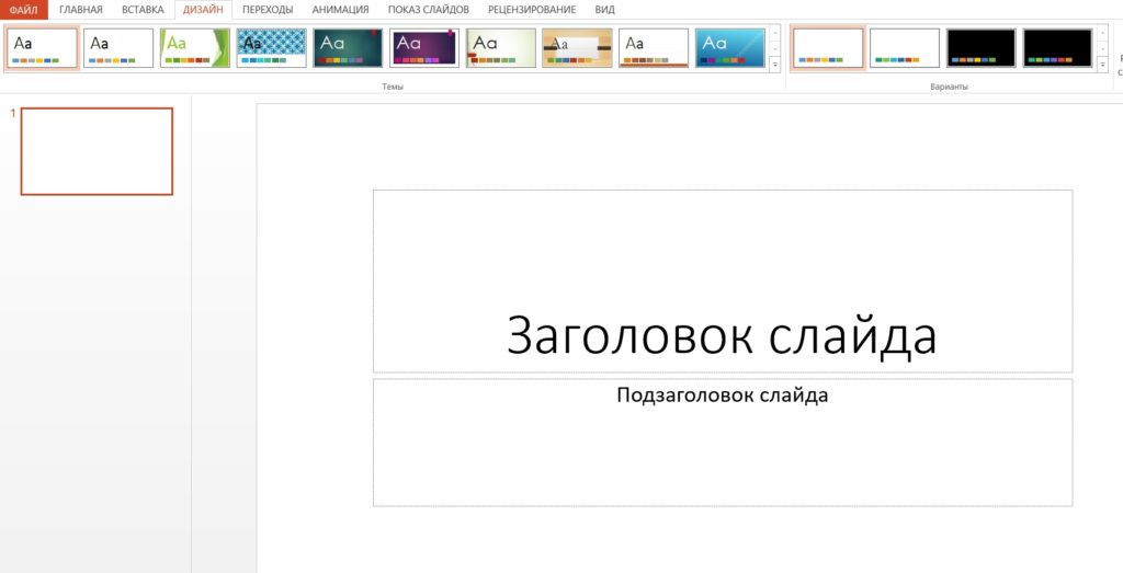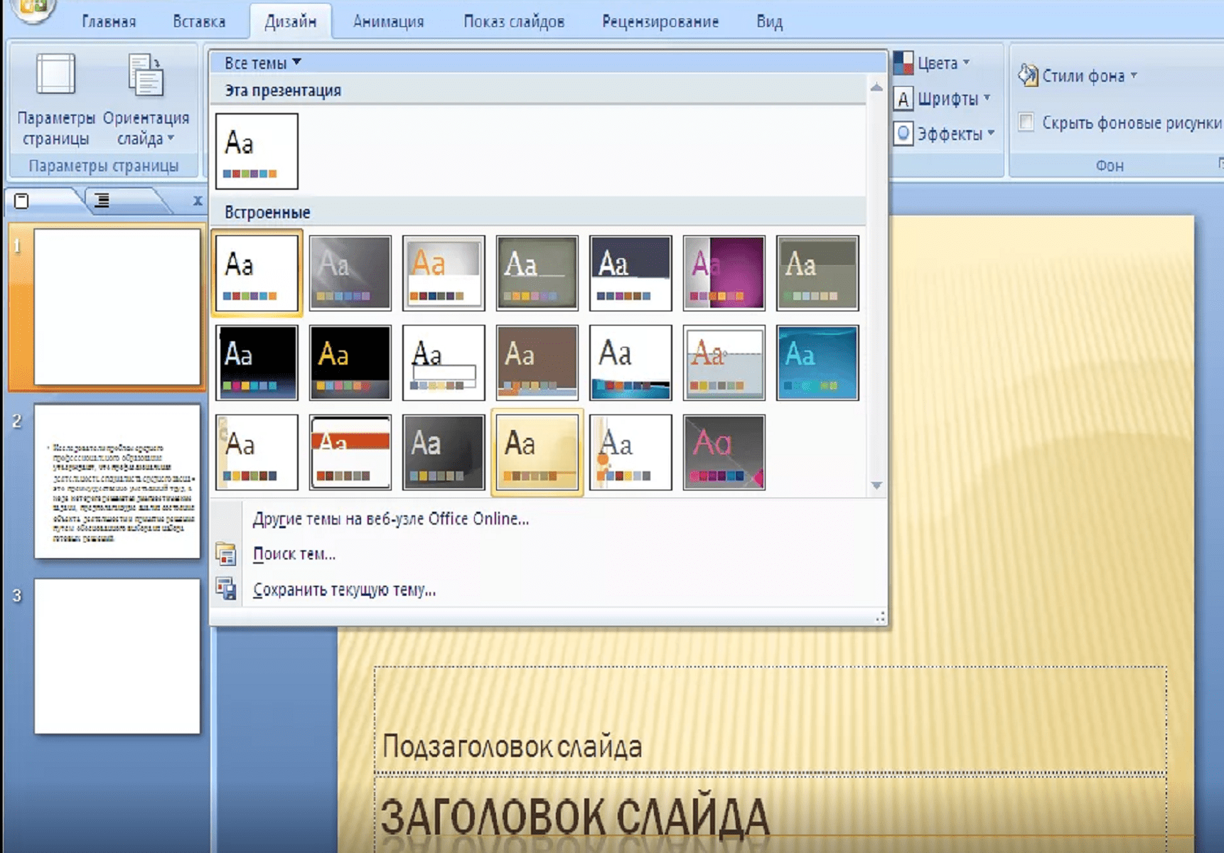 Воспользоваться инструментом можно во вкладке «Дизайн» (в других версиях софта она может называться «Оформление» или «Конструктор»). Откроется список вариантов тем. Пощелкайте на разные темы, посмотрите, как меняется оформление слайдов. Выберите тот, который наиболее отвечает по настроению тематике презентации и той аудитории, которой вы ее покажете. Учтите, что выбранная тема применяется ко всем слайдам.