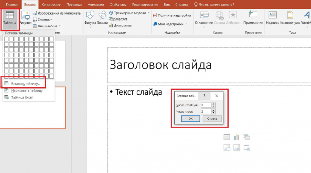 Программа для презентаций позволяет вставлять на страницу таблицу из Excel или самостоятельно создавать. Если вы знакомы с созданием таблиц в Word, то принцип идентичен.