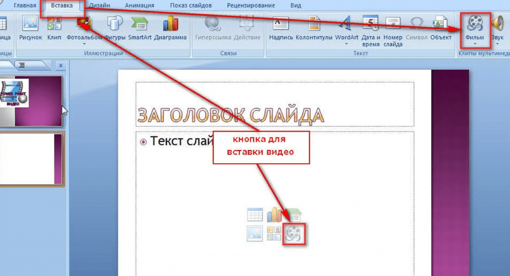 - В верхнем меню powerpoint выбирать раздел «Вставка».