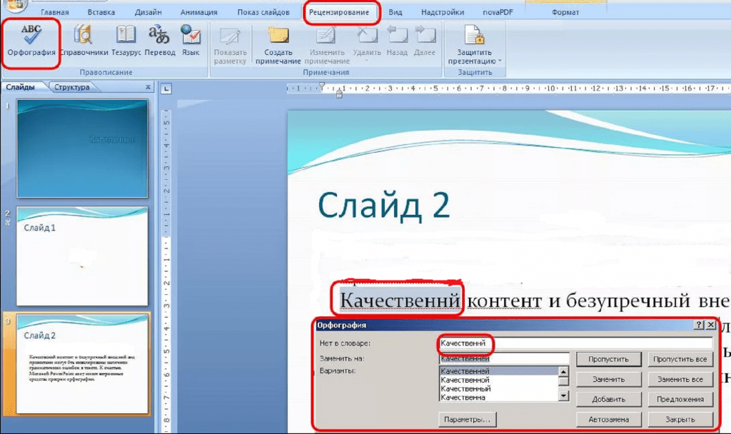 Перед сохранением проекта следует проверить презентацию на наличие орфографических, стилистических ошибок, опечаток. Последовательность рецензирования аналогична работе в Word.
