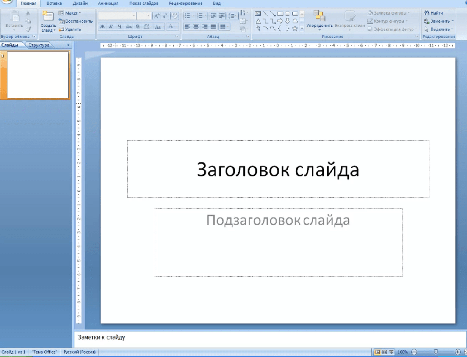 Чтобы приступить к созданию презентации врубаем программу Пауэр Поинт. Сразу после запуска открыта первая вкладка с названием «Главная», тут мы можем видеть пустой слайд, с которым уже можно работать.