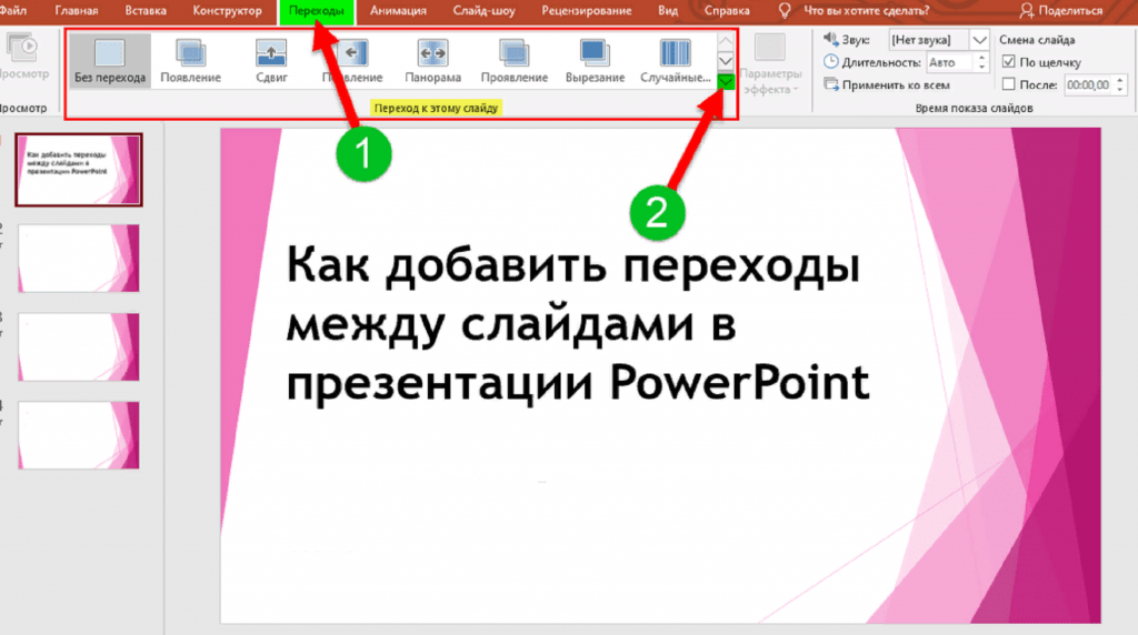 Помимо выбора перехода между слайдами на данной вкладке есть и другие настройки, которые касаются смены слайдов. Тут вы можно настроить автоматическую смену слайда по времени, воспроизведение звука при переходе и длительность перехода между слайдами.