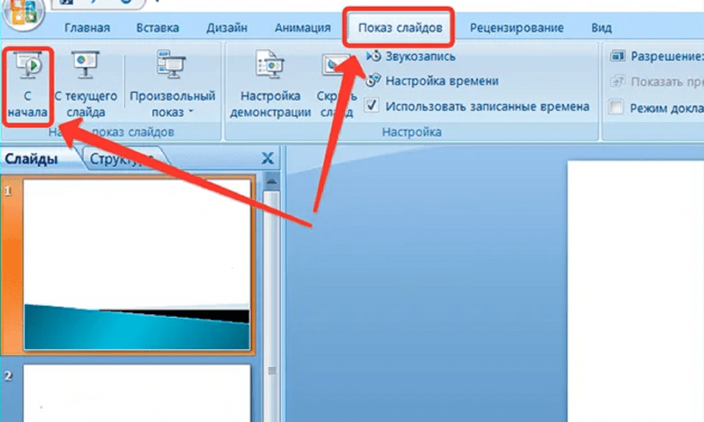 - кликните раздел «Слайд-шоу» или «Показ слайдов»;
