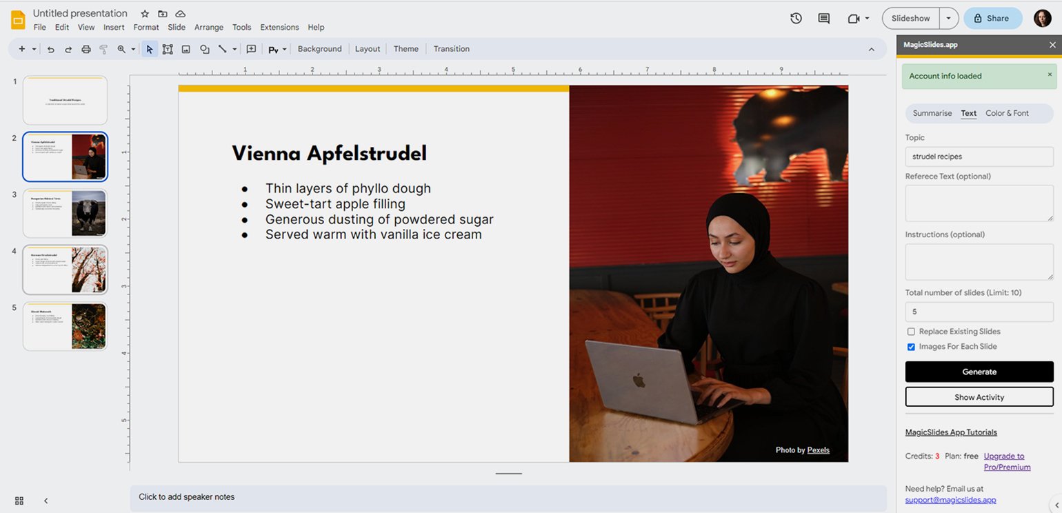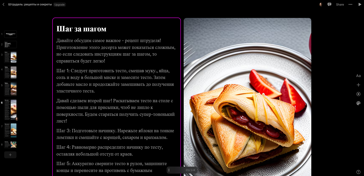 Недостатки. Формально плагин поддерживает все языки, но при попытке сгенерировать текст на русском зависает. Иногда неточно подбирает иллюстрации: например, к слайду про венский штрудель нам выдал фото мусульманки с макбуком.