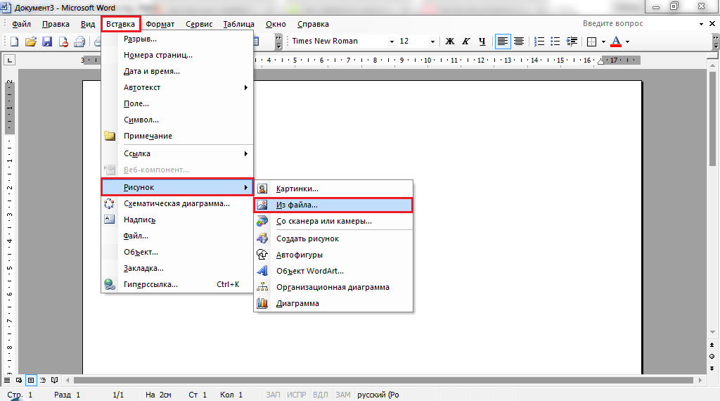- В верхней части окна программы раскройте раздел «Вставка», наведите курсор мышки на строчку «Рисунок» и в появившемся боковом списке щелкните по строчке «Из файла».