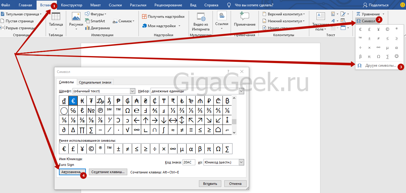 - Перейти в раздел «Вставка» — «Символ» — «Другие символы»;