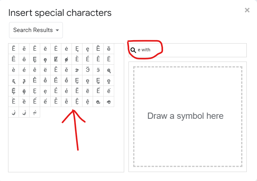 - Alternatively, use the drawing pad below the search bar to draw the symbol you want to insert. All you need to do is use the drawing pad to draw the letter e, and then the accent mark you need to place on it.