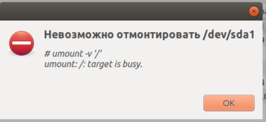 Перед установкой загрузчика windows нужно разметить диск, есть стандартная и пожалуй лучшая утилита GParted. Для начала нужно разметки диска его нужно от монтировать sda1, и тут возникает ошибка: