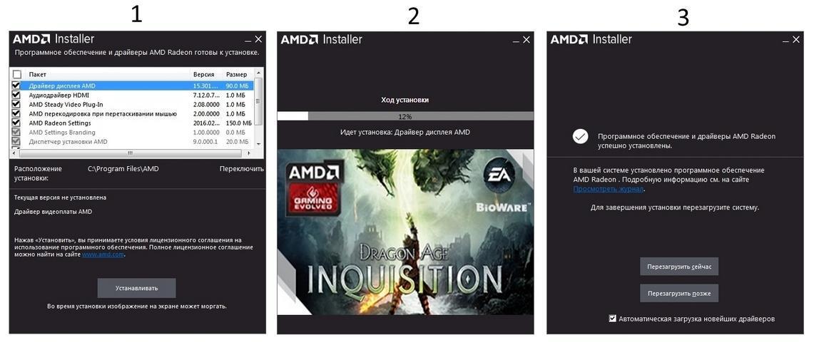 Процесс установки драйверного ПО видеокарт AMD Radeon RX 480 и GeForce GTX 1060 очень прост и сводится в основном к нажатию кнопки . Поэтому, с этой задачей должен справиться практически любой пользователь. Ниже показан рисунок поэтапной установки ПО AMD Radeon Software Crimson Edition для видеокарты AMD Radeon RX 480.