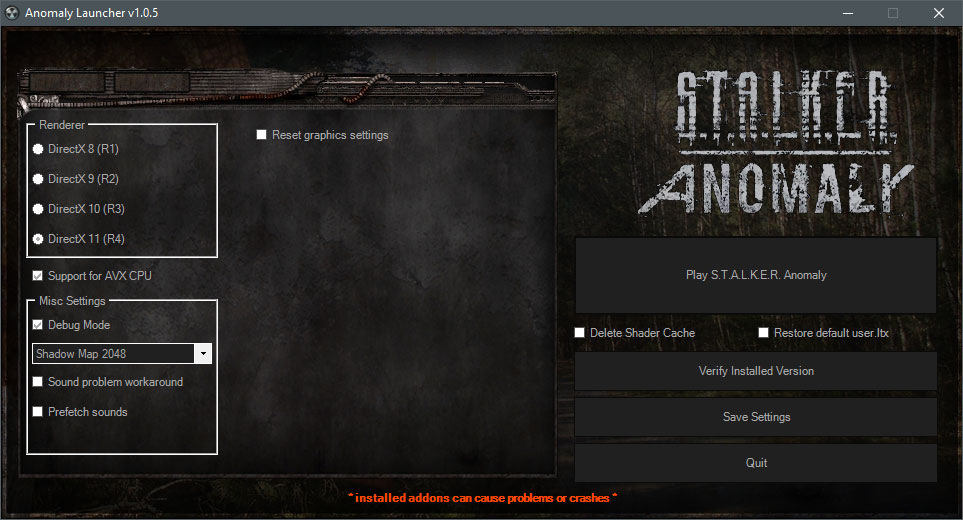 5. Выбираем настройки рендеринга и жмем кнопку Play S.T.A.L.K.E.R. Anomaly