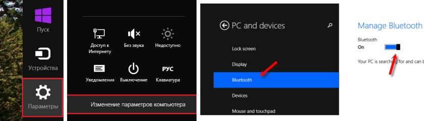 Если на вашем ноутбуке установленWindows8, то для запуска блютуза сделайте следующее: