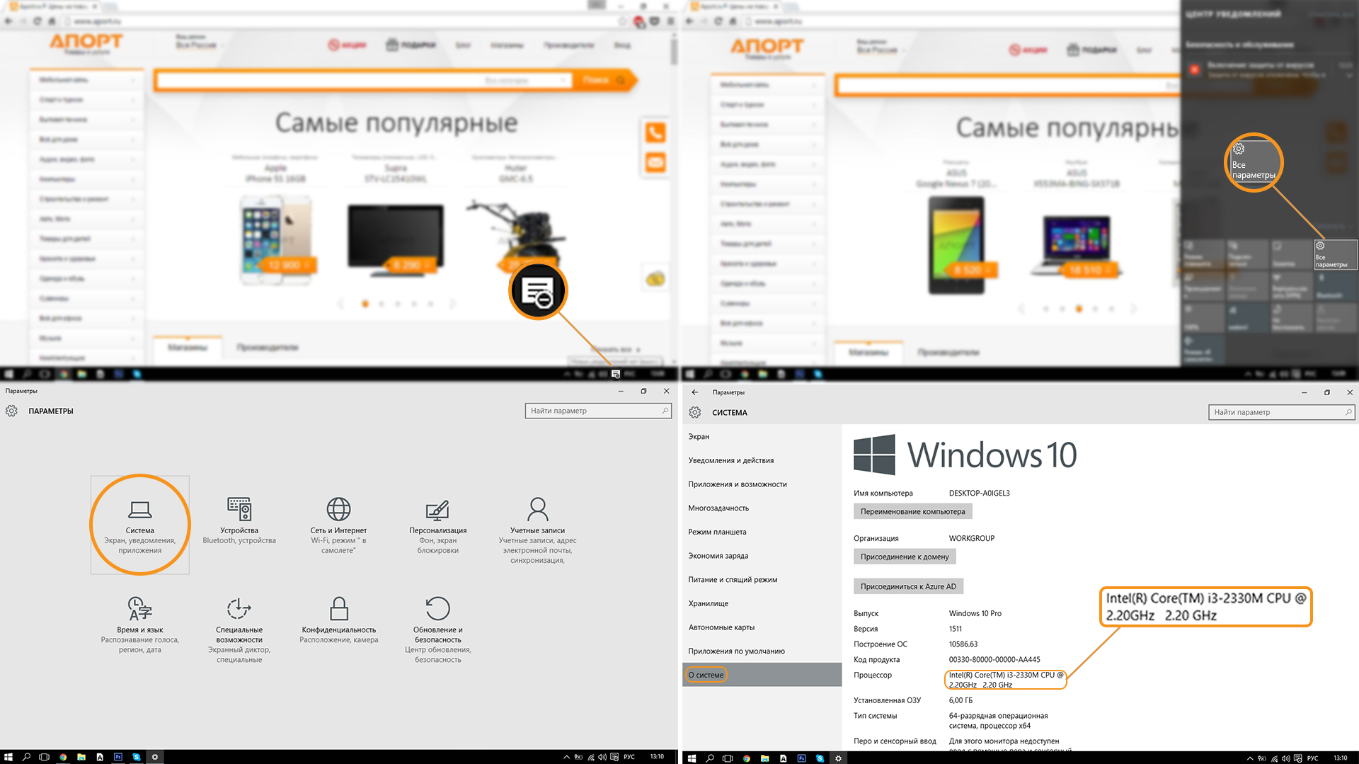 В правом нижнем углу экрана есть панель уведомлений. Левый клик мышью — проходим в меню Все настройки