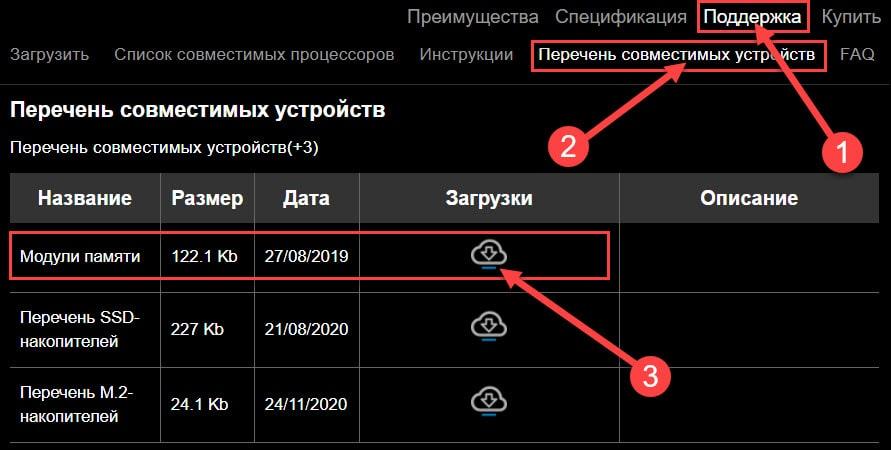 На сайте производителя материнской платы нужно перейти в раздел «Характеристики» или «Specifications» и найти там информацию о совместимости с оперативной памятью.