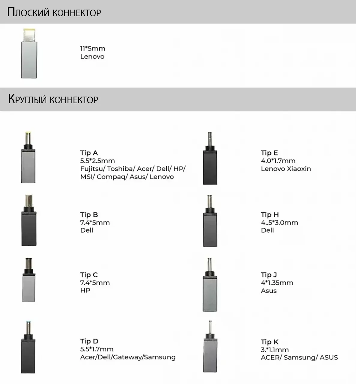 Блоки питания различаются типом разъема. В основном это контактные части зарядки, непосредственно вставляемые в ноутбук. У некоторых производителей ноутбуков при одинаковых электрических параметрах, разъемы блоков питания различаются. Кроме того, в некоторых случаях, когда все же удается подключить контакт в разъем ноутбука, соединение может быть ненадежным и в дальнейшем привести к поломке соединения. Ниже приведен список разъемов блоков питания с их размерами и совместимыми марками ноутбуков.