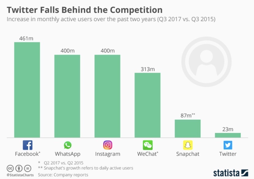 Новое исследование от Statista показало, что в 2017 году Twitter сильно отстал от соперников. Он продемонстрировал самый низкий прирост ежемесячной активной аудитории, который с 3 квартала 2015 года по 3 квартал 2017 года составил всего 23 миллиона. Facebook меж тем разросся на 461 миллион.