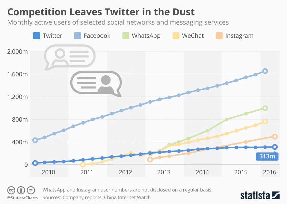 Маркетологи обычно отводят на SMM не очень много времени. В какой же соцсети сконцентрировать усилия? Twitter, которому с 2010 по 2017 год удалось собрать аудиторию в 313 миллионов пользователей, показал самые медленные темпы роста в сравнении с его крупнейшими конкурентами Facebook, WhatsApp и китайской WeChat. Основанный в 2013 году Instagram уже к 2014 году переплюнул Twitter по размеру аудитории.