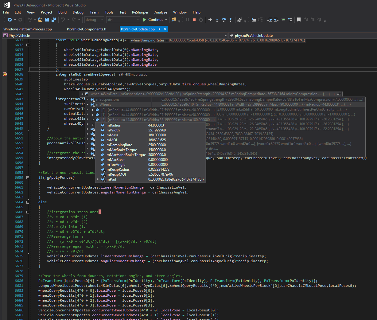 The image below demonstrates how the standard vehicle implementation in PhysX can be investigated using the Visual Studio debugger.