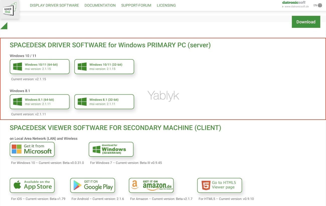 2. Пролистайте главную страницу сайта вниз до раздела «Download» и скачайте серверную часть приложения в разделе «Spacedesk Driver Software for Windows Primary PC (server)» в зависимости от версии и разрядности системы (обычно это 64-bit).