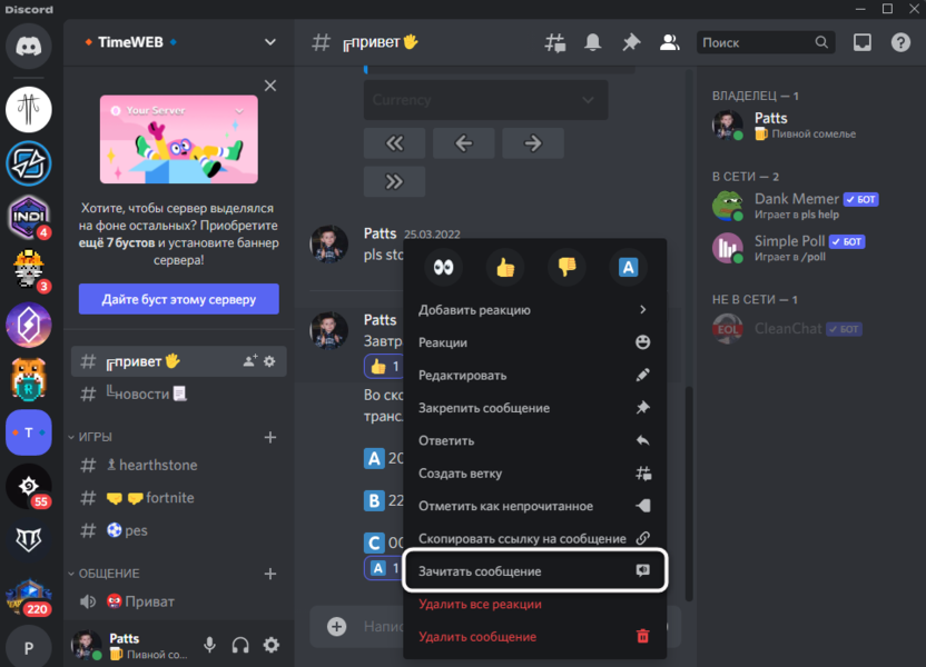 Давайте сначала разберемся с основной функцией и рассмотрим, как перевести сообщение в речь и заставить бота воспроизвести его. Для этого сначала отыщите само сообщение и щелкните по нему правой кнопкой мыши.
