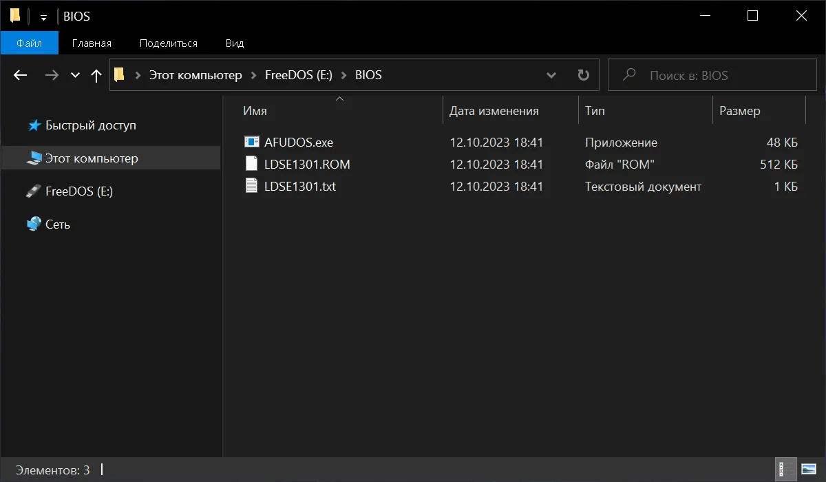 В папке BIOS на флешке лежит исполняемый файл утилиты AFUDOS.exe и прошивка BIOS с расширением ROM (в моем случае это файл LDSE1301.ROM, так как материнская плата ASUS P5LD2 SE)