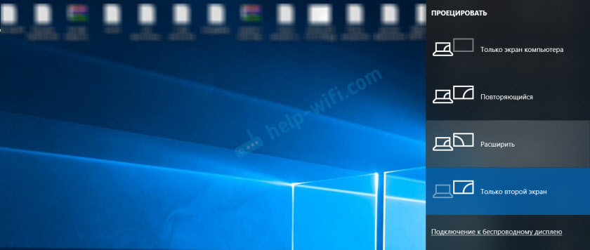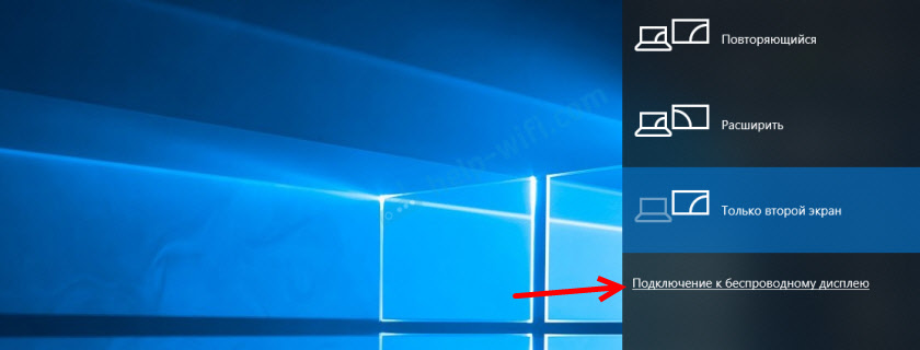 Дальше на компьютере с которого мы будем выводить изображение по Wi-Fi нужно перейти в меню «Проецировать». Для этого нужно нажать сочетание клавиш Win + P. И перейти в радел «Подключение к беспроводному дисплею».