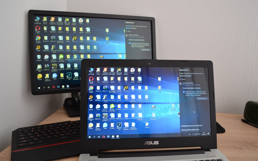 Чтобы подключение удалось установить, на видеокарте в системном блоке должно быть минимум два выхода. От одного выхода кабель идет к монитору ПК или телевизору, от другого – к ноутбуку. Настройка рабочего стола осуществляется на компьютере, ноутбук пока будет вторым дисплеем.