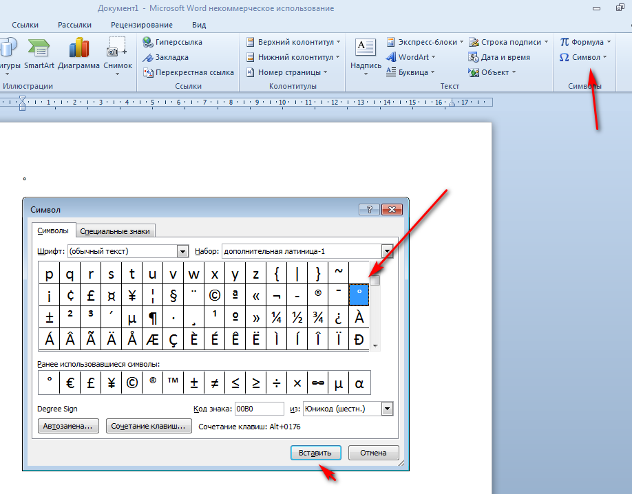 и дважды кликните по значку градуса. Он отобразится в том месте, где установлен курсор.