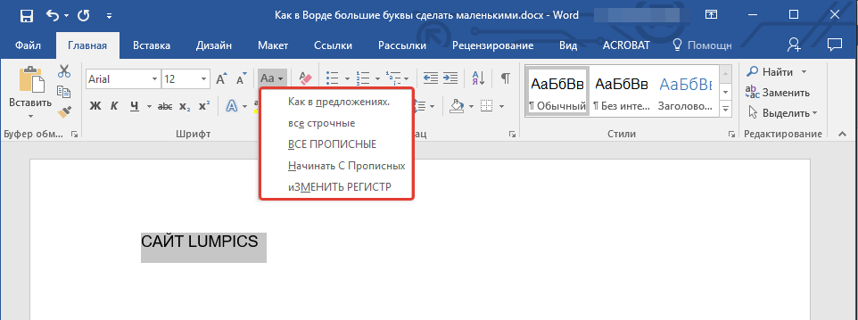 При этом в ниспадающем меню выберите нужный тип изменения регистра букв: