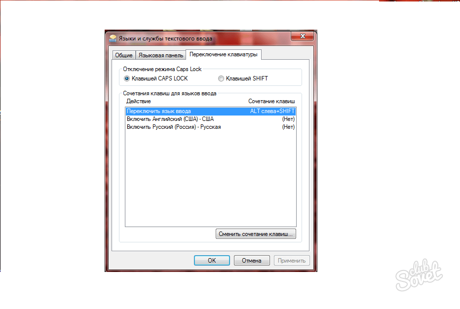 Плюс к этому можно использовать и другие сочетания клавиш. Перейдите по кнопке «Сменить сочетание клавиш…» и выбирайте тот расклад, который вы хотите установить по умолчанию.