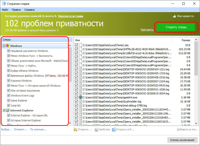 В разделе программы «Безопасность» запускаем «Стирание следов».