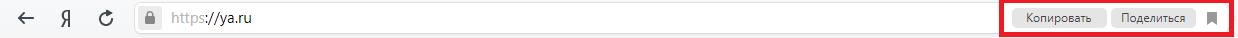 Находясь на любом сайте на «Умной» строке слева в серой рамке отображается домен или URL, а после тайтл (метаданные страницы). При фокусировке курсора мыши отображается полный адрес страницы и справа появляются кнопки «Копировать»/«Поделится».