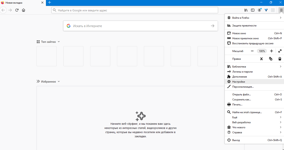Найти папку с загрузками в браузере Firefox можно буквально за несколько секунд. В правом верхнем углу откройте меню «бургер» и выберите из появившегося списка пункт «Настройки».