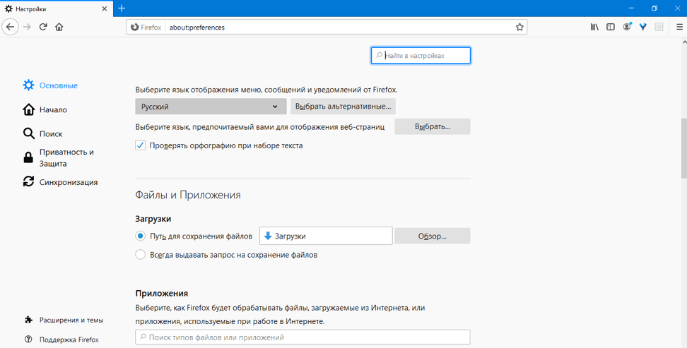 После того, как перед вами откроется окно с настройками, потребуется немного пролистать его вниз — до пункта «Файлы и приложения». Ниже, рядом с надписью «Загрузки», будет указана папка, в которую по умолчанию сохраняются скачиваемые файлы.
