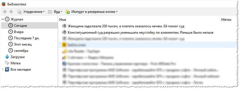 Кстати, в Firefox журнал посещений (см. скрин ниже), на мой взгляд, выполнен почти идеально: можно смотреть сегодняшнюю историю, вчерашнюю, за последние 7 дней, за этот месяц и пр. Можно сделать резервную копию, или экспортировать/импортировать записи. В общем-то, все что нужно — под рукой!