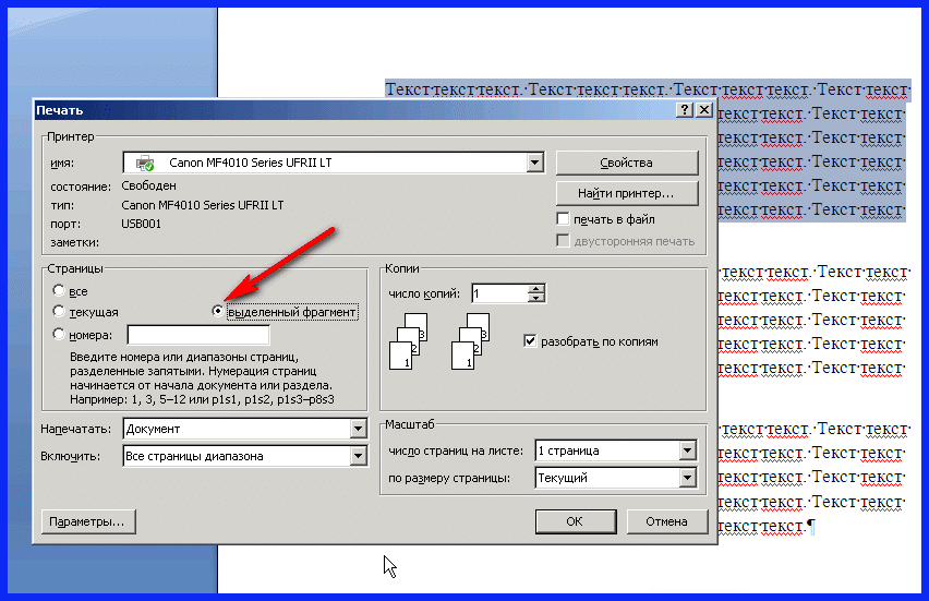 После этого непосредственно в настройках параметров печати найдите и установите флажок «выделенный фрагмент». Кстати, в Word можно настроить печать как отдельной группы страниц, так и текущей; печатается только одна страница. При печати выделения будет напечатано только выделение, независимо от того, сколько листов оно занимает. Однако исходное форматирование будет потеряно. Особенно это будет заметно, если выделение началось примерно с середины страницы.