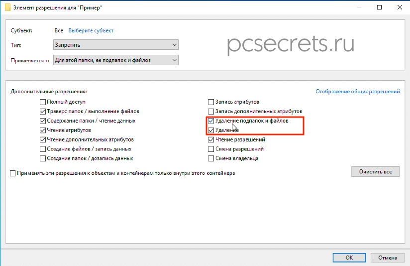 Также, в случае необходимости, Вы можете запретить удаление только некоторым пользователям, а не всем.