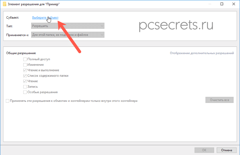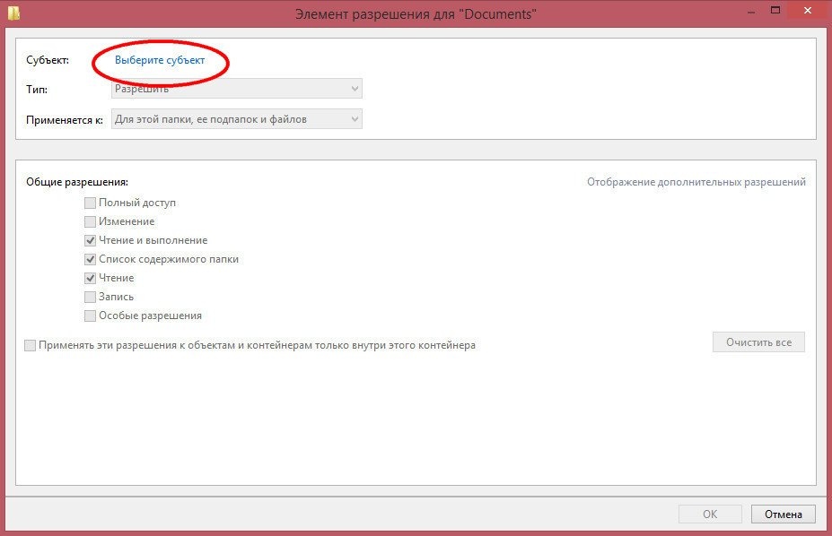 Сначала нам нужно выбрать субъект, т.е. для кого (каких пользователей) будет действовать это разрешение.
