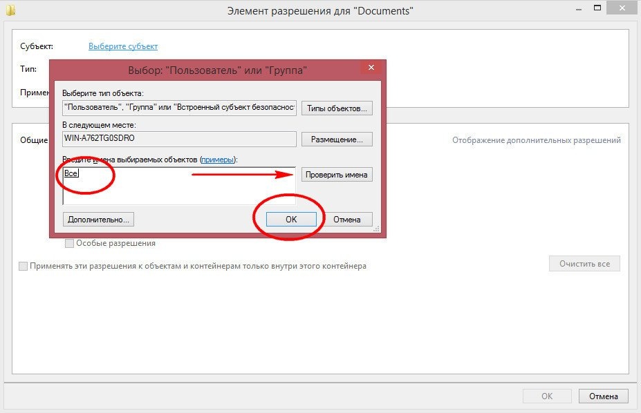 Затем, так как мы хотим запретить удаление файлов и папок для всех, включая нас самих, нам можно (и нужно) выбрать специальную группу «Все», в которую включаются абсолютно все пользователи компьютера.