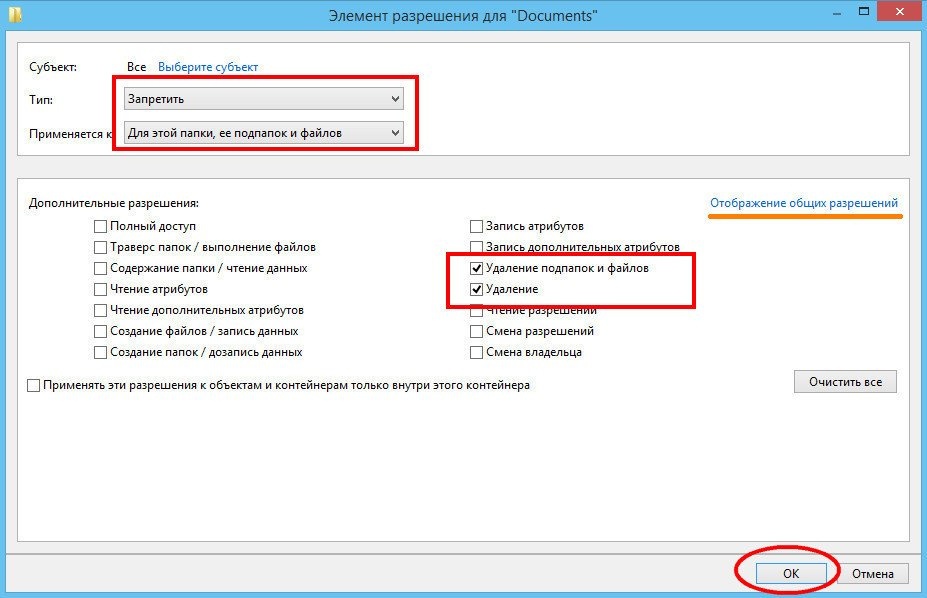 Сначала выбираем тип разрешения, т.е. что мы хотим «Разрешить» или «Запретить», мы хотим запретить удаление, поэтому выбираем «Запретить».