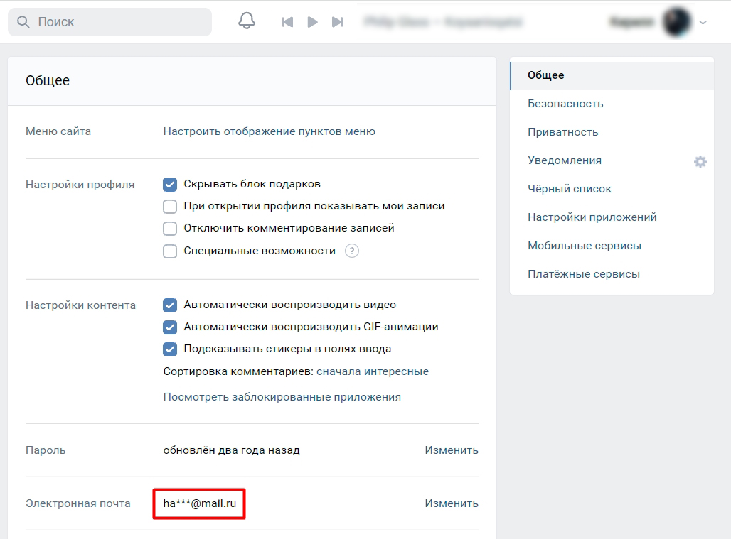На вкладке «Общее» смотрим подсказку по «Электронной почте». Итак, точный адрес мы не видим, и сайт об этом позаботился. Что мы можем сделать? – мы можем попробовать тот способ с подсказкой от браузера, о котором я писал чуть ранее. Чтобы не выходить из аккаунта, мы попробуем открыть вкладку «Инкогнито».